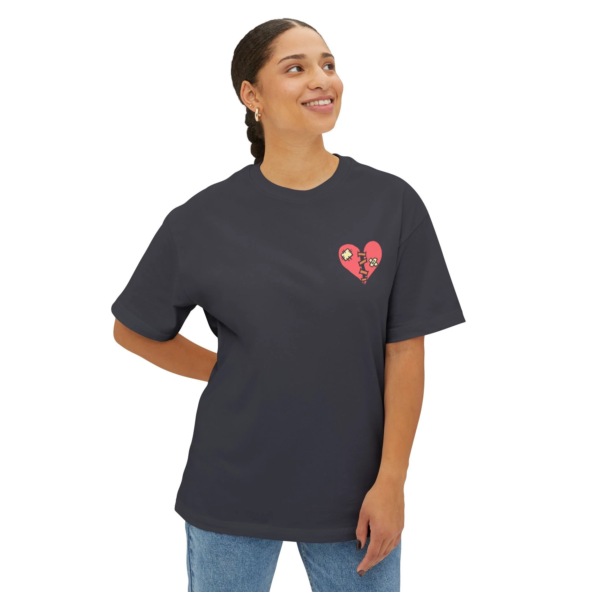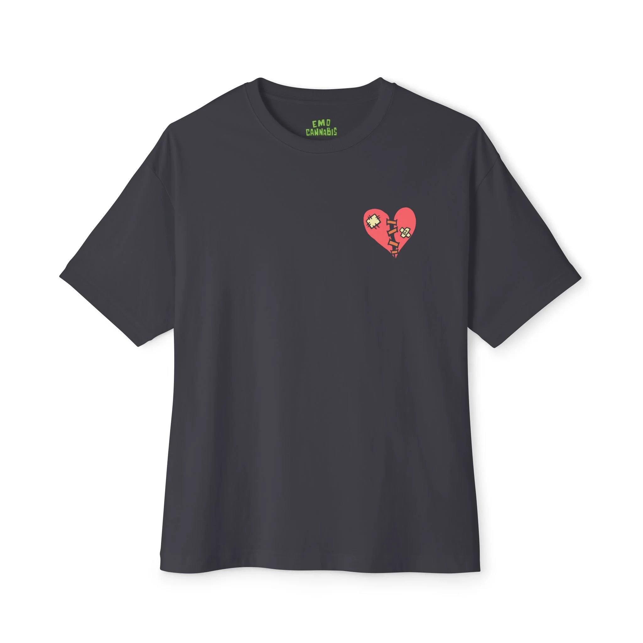 Bold and colorful 90s cartoon-style tee featuring a skull on the back with smoke coming out and a broken heart on the front, designed for emo stoners. Gives off a retro and edgy vibe, perfect for casual wear or music concerts. Ideal for those who love nostalgic designs and want to make a statement with their clothing. Relevant for Halloween, music festivals, and everyday streetwear.
